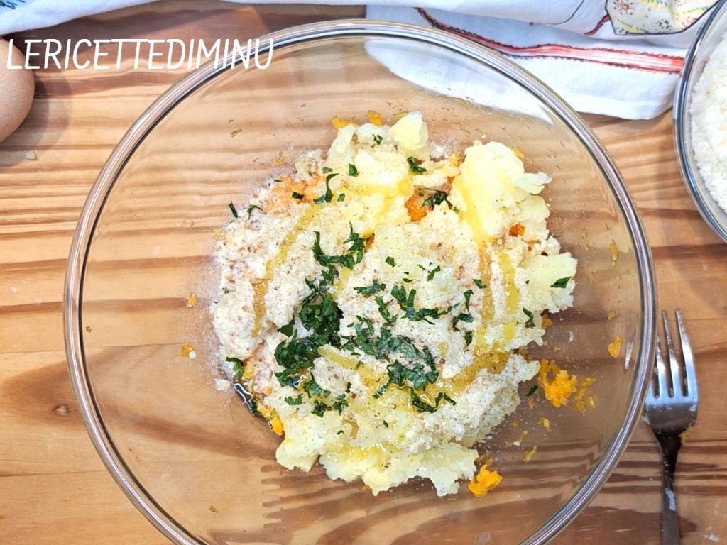 • In a large bowl, combine carrots, potatoes, a scant tablespoon of breadcrumbs taken from the 1/2 cup in the recipe, salt, finely chopped parsley, ground black pepper, a drizzle of oil, grated Grana Padano, and the egg.