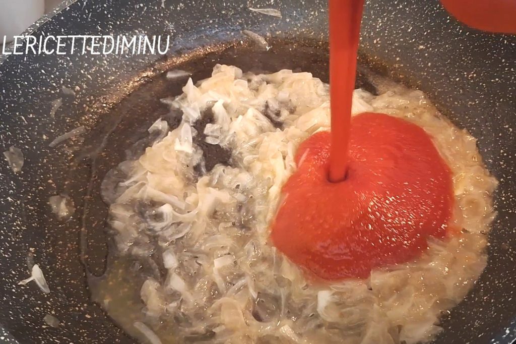 • When the onion is soft, add the tomato sauce, a little water, and a piece of hot red chili pepper to the pan. Cover with a lid, leaving a side vent.