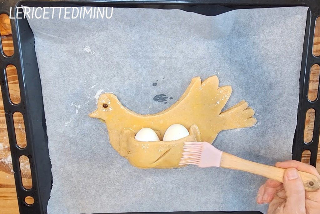 With the beaten egg we prepared earlier, carefully brush the entire surface of the cuddura, including the hard-boiled egg and strip.