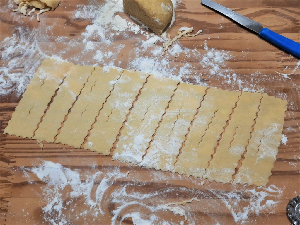Cut the obtained sheet into strips with the fluted wheel and make one or two cuts in the center of each strip.