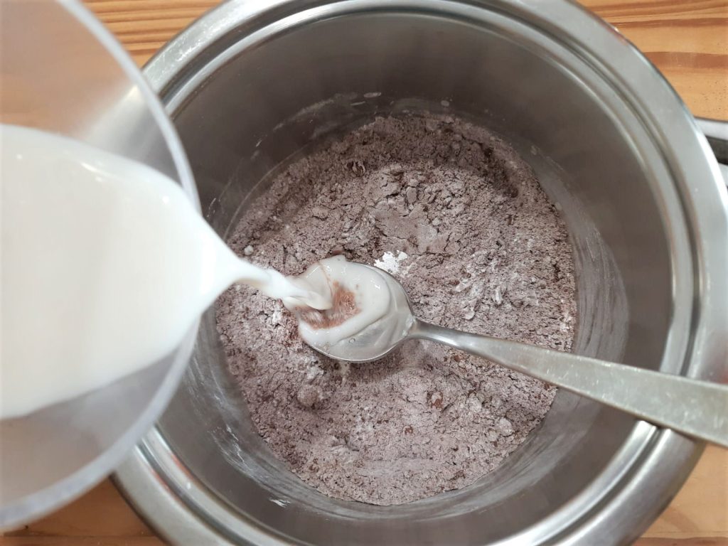 • Gradually add the plant-based milk, always stirring with a whisk or a wooden spoon.