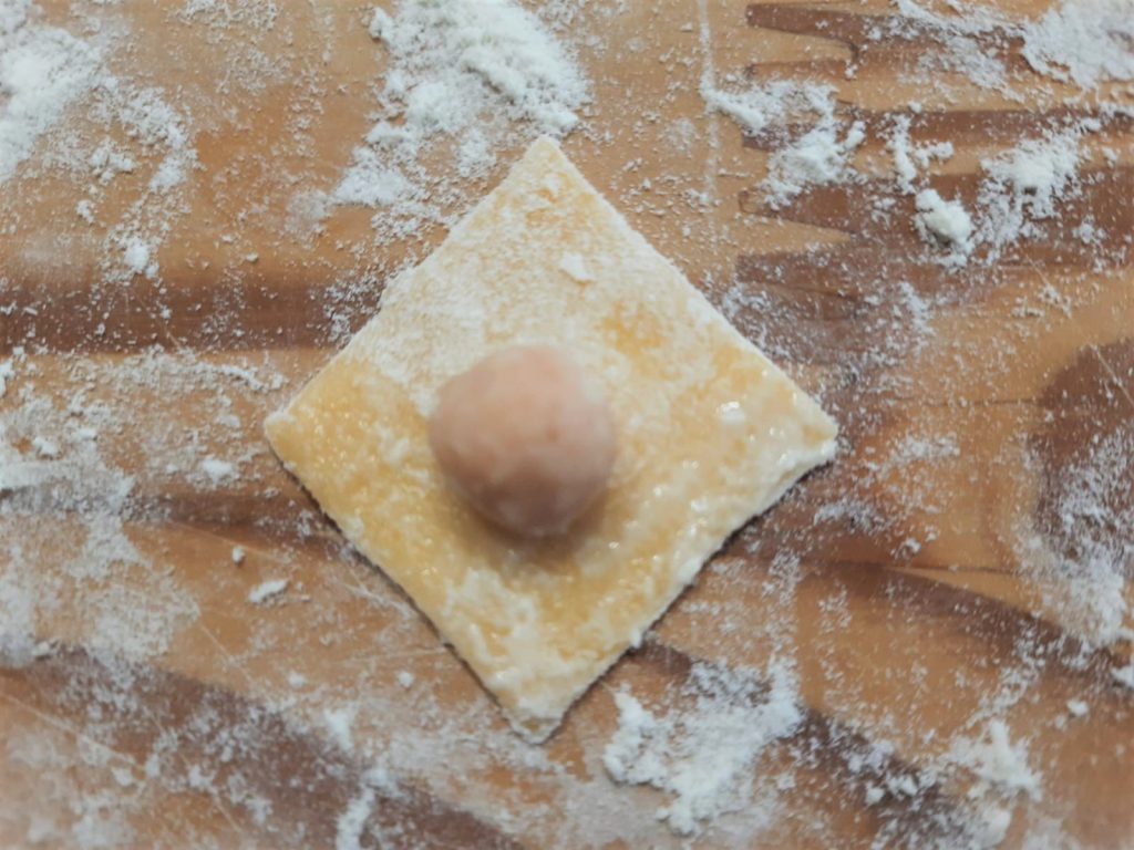 Take each square, lightly moisten two consecutive sides with water, and place a small amount of filling in the center, compacting it with your fingers. Fold into a triangle, squeezing out all the air first.