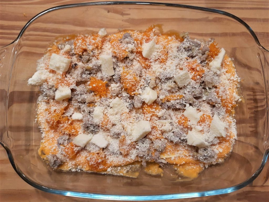 The lasagna with pumpkin, sausage, and sweet provola cheese is ready.