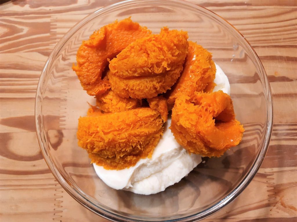 If desired, you can bake all the pumpkin in the oven and cut slightly less than half into cubes after cooking; it will be lighter, and I often do so myself.