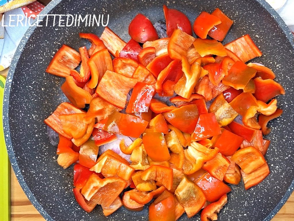 Wash the bell peppers, remove the stem, cut them into slices, and then remove the seeds and internal filaments.