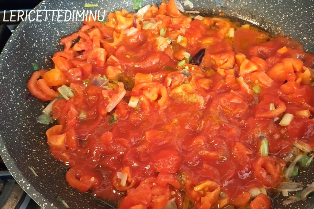 • Let it season for a few minutes, then add the tomato sauce, sufficient water to bring to cooking, and cook on low heat for about 15 minutes.
