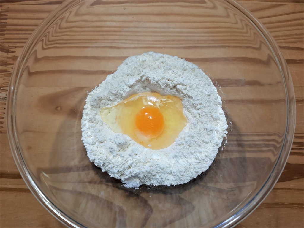 Add 1 medium egg, and while working with a fork, pour in the warm water, butter, and grappa.