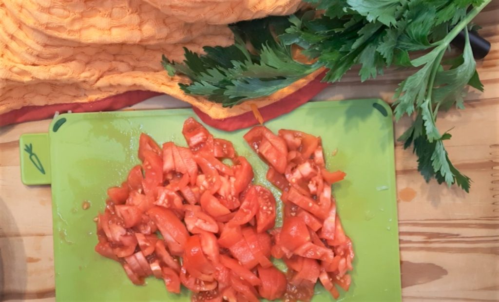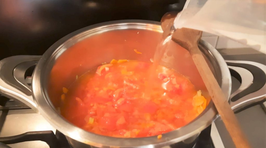 After this time, add the tomatoes without skin and seeds, cut into pieces, and about 27 oz of water.