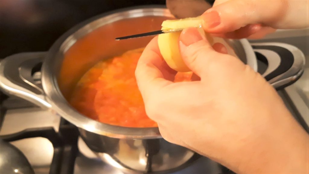 Then add a peeled and sliced potato (it will add creaminess to the dish) and a bay leaf.