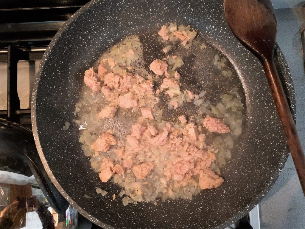 Wait for it to get some color, then add the drained and crumbled tuna, sliced black olives, and a piece of red hot chili pepper. Allow a few minutes to flavor, stirring occasionally.