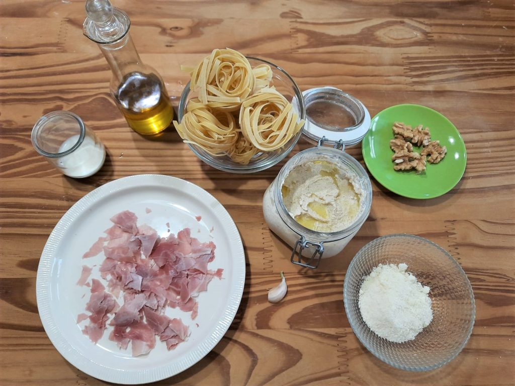 Prepare the pasta with walnut pesto and ham without cream by starting with the pesto.