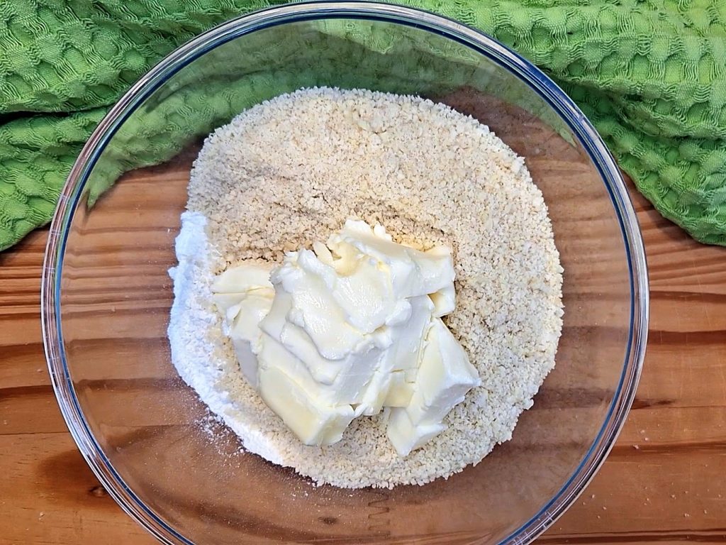 • Separately, in a bowl work the flour, chopped almonds, and butter cut into pieces.