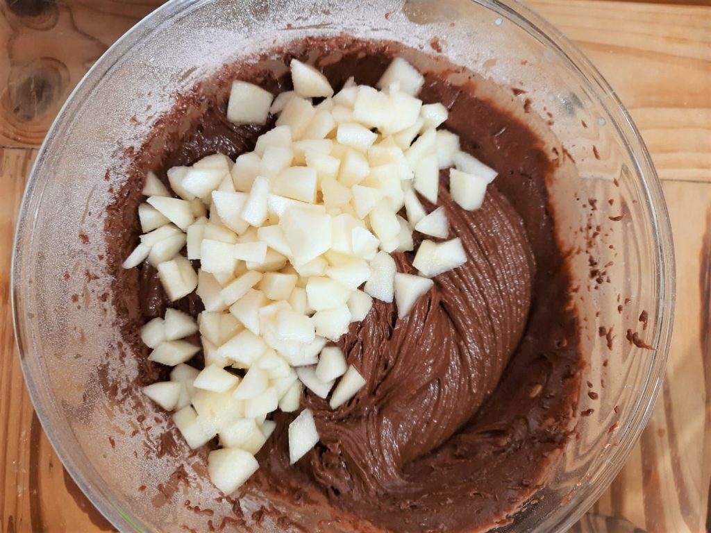 Finally, add the pears and distribute them evenly in the batter.
