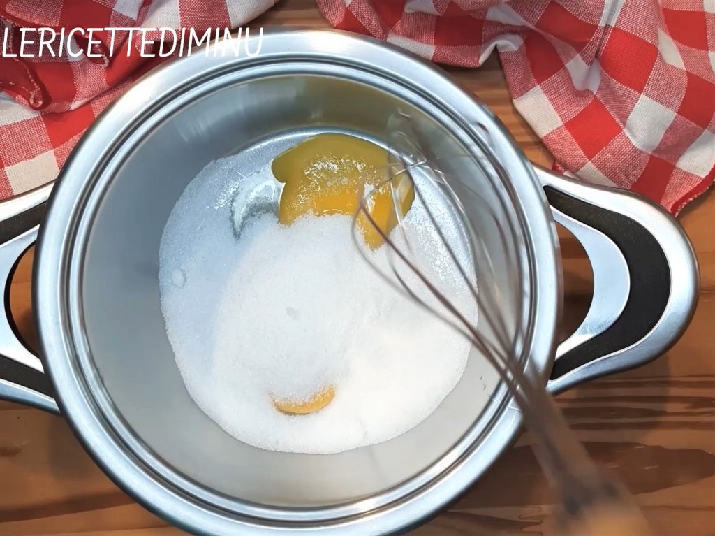 Then proceed to make the cream by combining the sugar and vanillin with the egg yolks in the saucepan where we will thicken it, and work them with a hand whisk.
