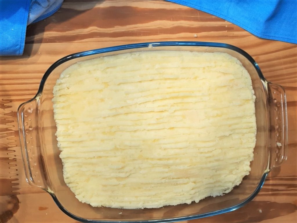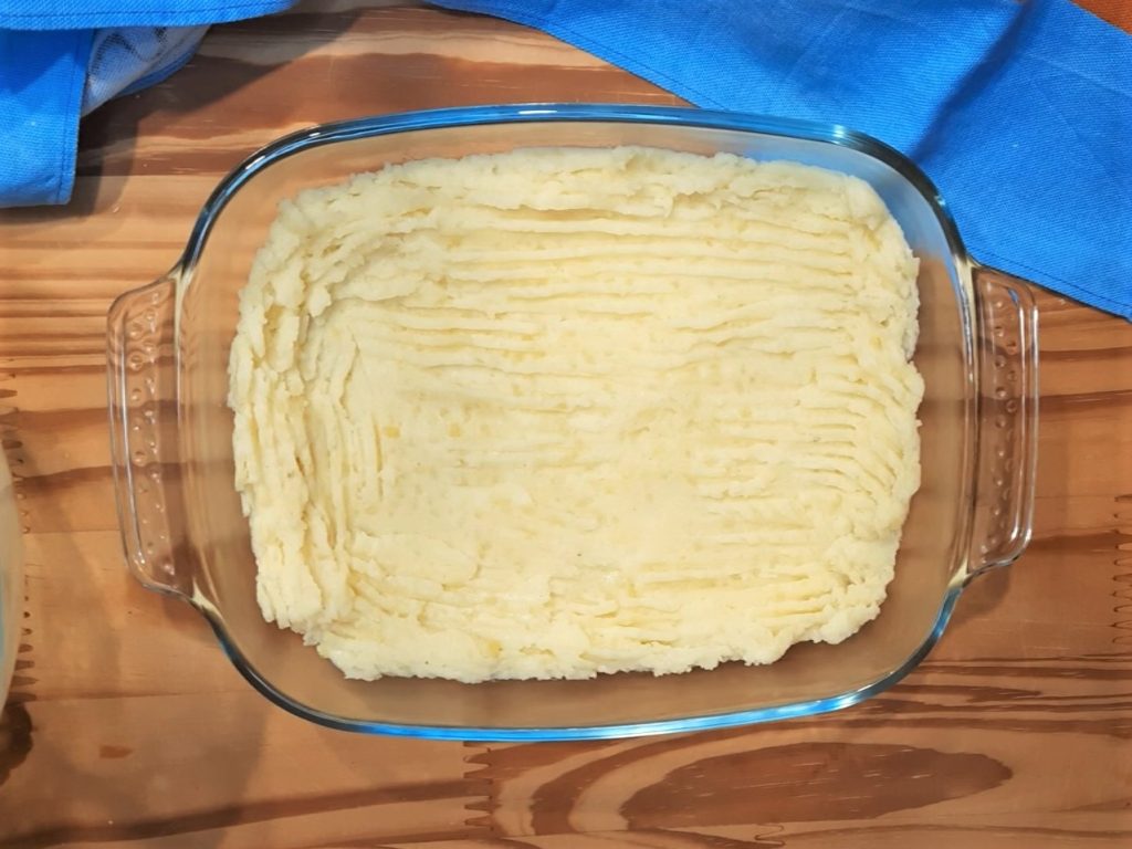 Close with the remaining potato mixture and press with a fork to level. This will also create the typical ridged surface of the gateau.