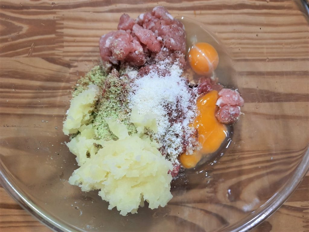 • Knead the ground beef and pork sausage with breadcrumbs, mashed potato, two eggs, and grated Parmesan cheese. No need to add salt.