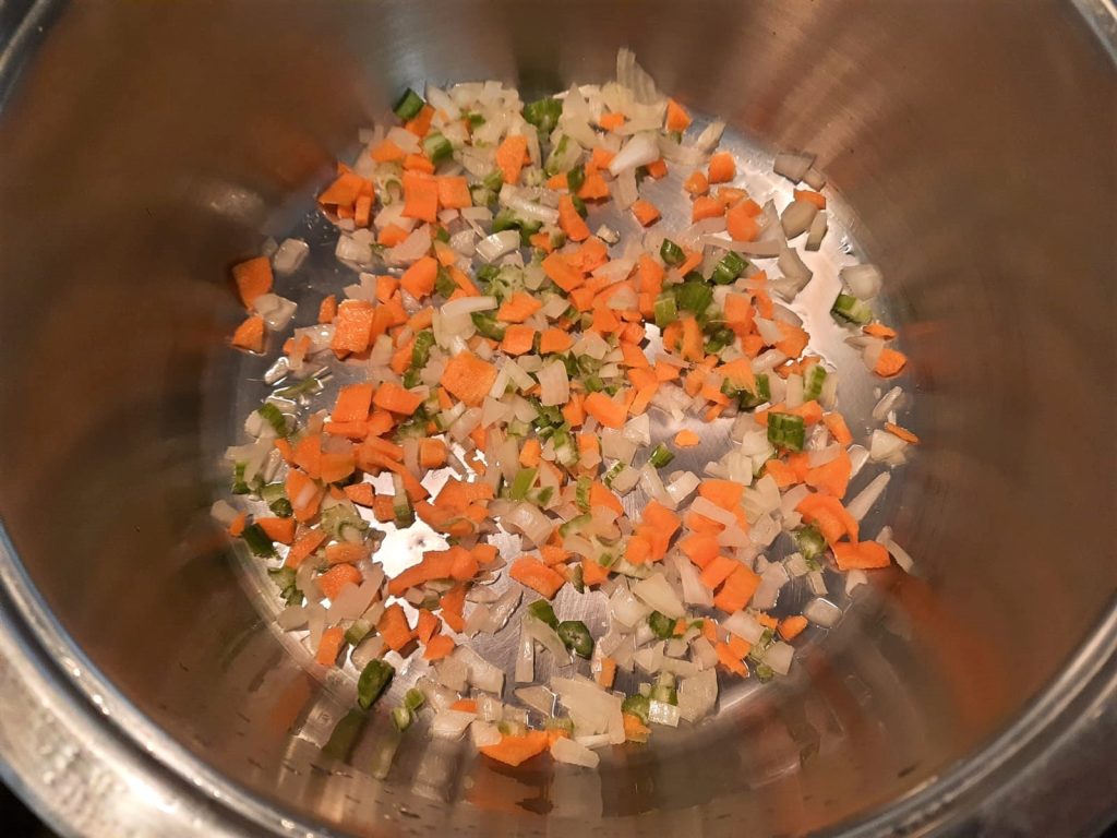 • In a large, thick-bottomed pan, sauté the chopped onion, carrot, and celery in about 6 tablespoons of olive oil.