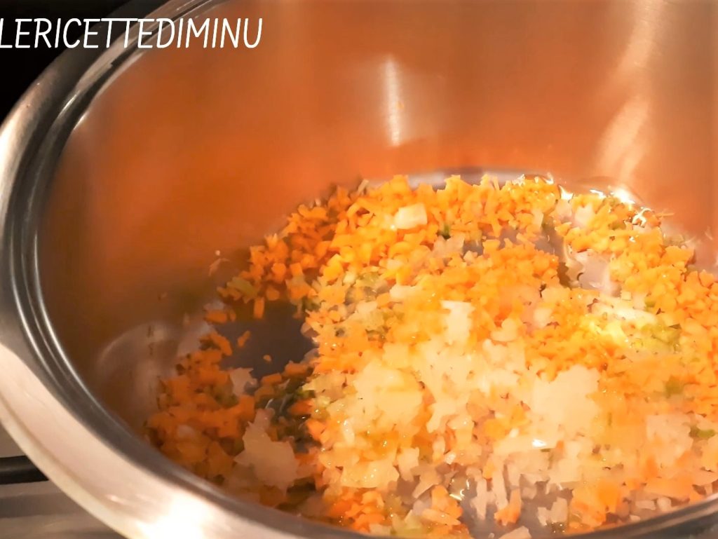 In a large pan, sauté in a little olive oil: finely chopped onion, carrot, and celery.