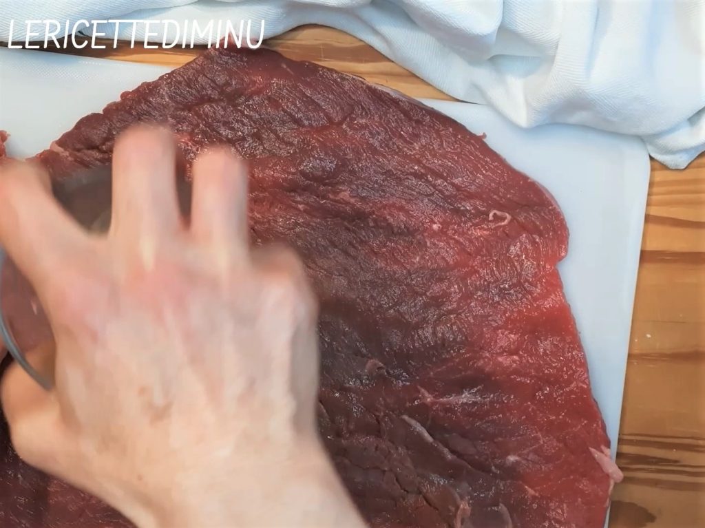 Prepare the slice of meat on the cutting board by pounding it to ensure even thickness across its entire surface.
