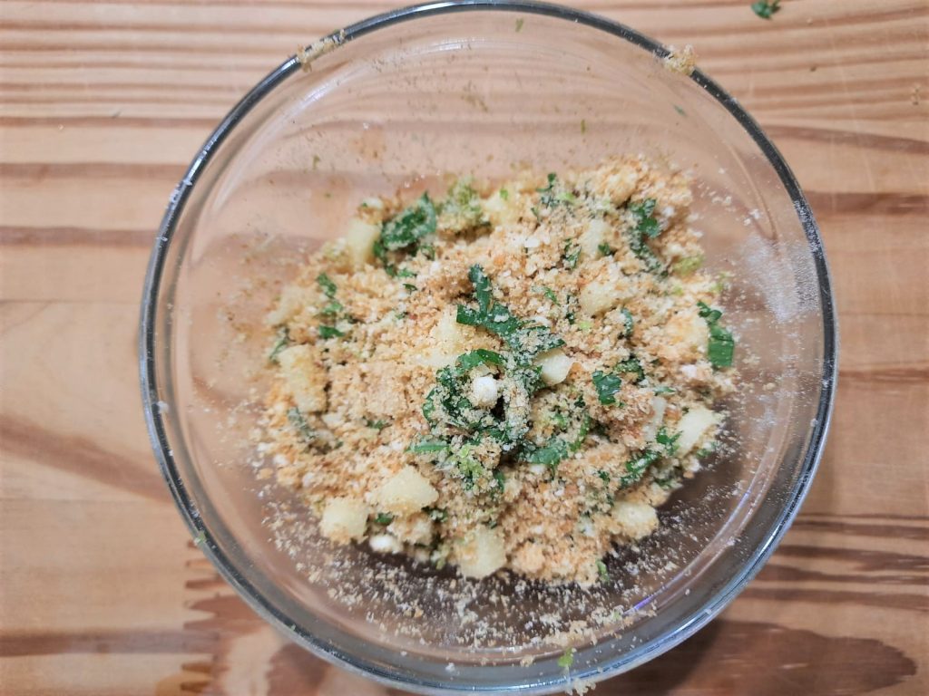 In the mixer bowl, combine the breadcrumbs, parsley, and garlic.