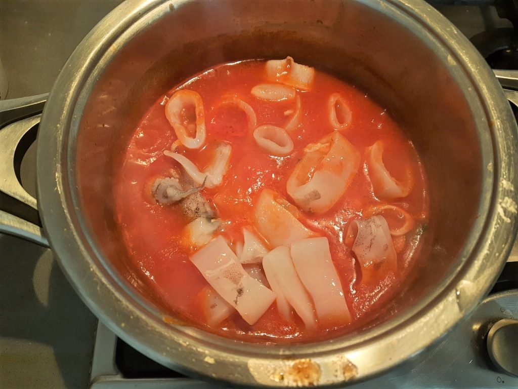 When the sauce starts to smell cooked, add the squid and let them cook for about 10 minutes, stirring occasionally.