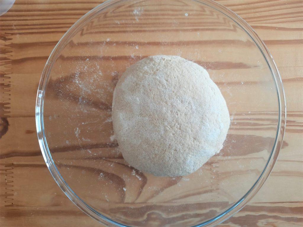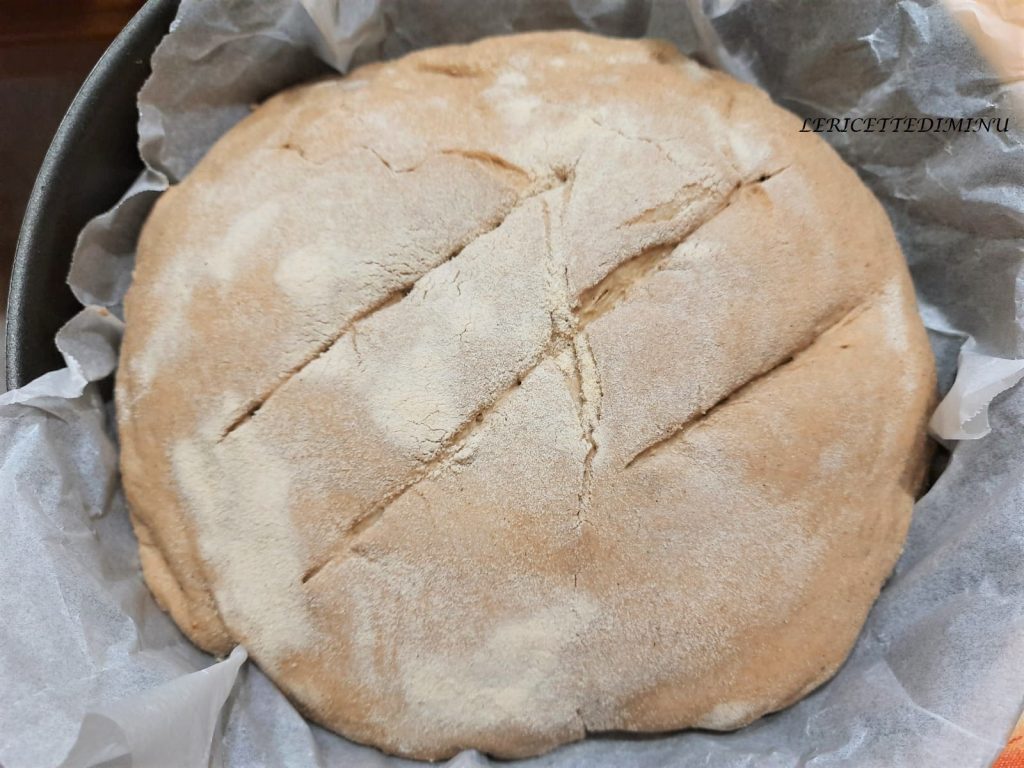 Shape the dough into a round form, lightly flouring both the bottom and top, and place it in a bowl to rise at room temperature, covered with plastic wrap for 2 hours.