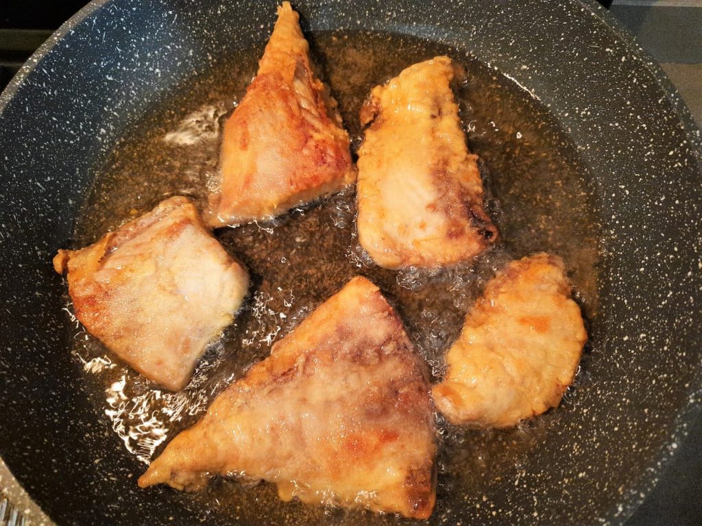 • Meanwhile, heat a non-stick pan with plenty of peanut oil and, when it’s hot enough (so that bubbles form around the handle of a wooden spoon dipped into the oil), fry the tuna steaks, turning them halfway through cooking.