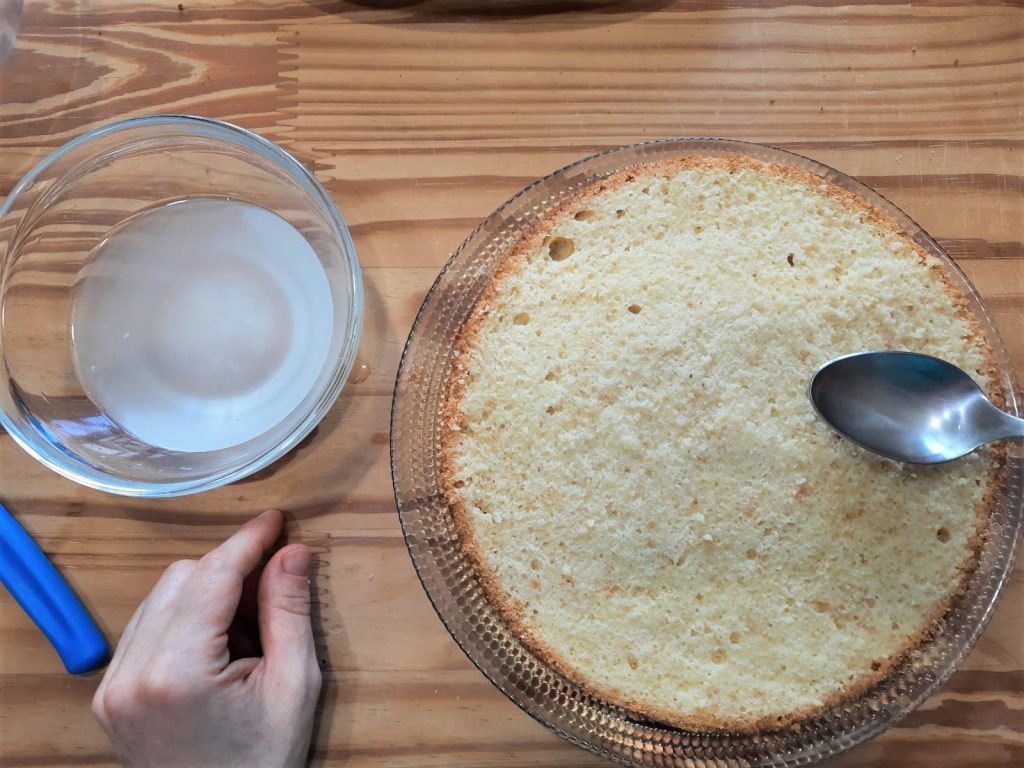 Level the cake by removing the dome, then cut the cake in half with a cake slicing knife and soak with water and powdered sugar dissolved in it.
