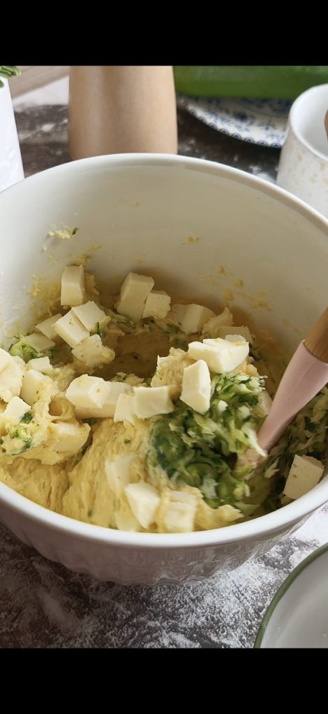 • Then add the well-squeezed zucchini and the cheese cubes, mixing to distribute the filling evenly.