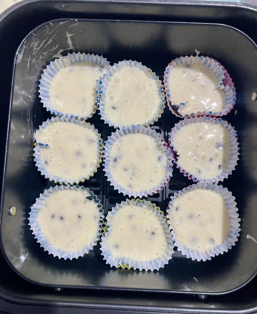 • Place the paper muffin cups directly in the air fryer baskets and fill them about 3/4 full with the batter. Cook the muffins at 338°F for about 18 minutes. Before turning off the air fryer, check that they are well browned on the surface.