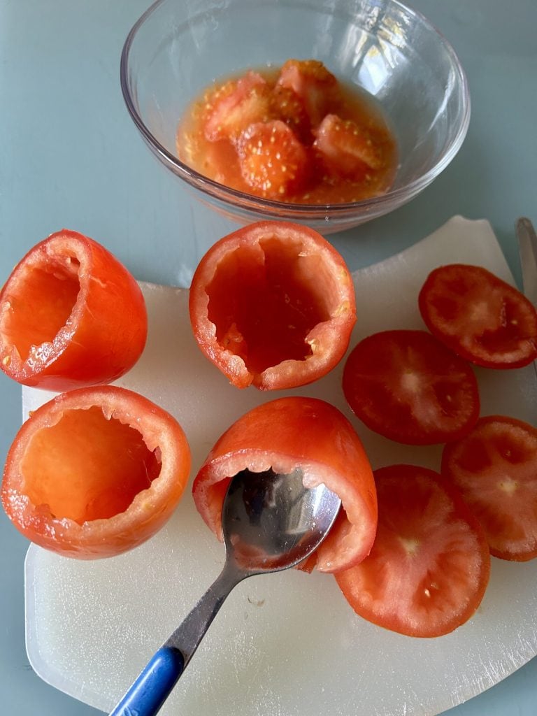 Air Fryer Tomatoes with Rice, I wanted to try this cooking method to reduce time, and I must say the final result satisfied me. Of course, you can also prepare the tomatoes with rice in the oven. As you can see from the picture, I use red vine tomatoes, choosing the larger ones because I personally find them tastier than those grown specifically to be baked with rice, but this is just a little suggestion of mine.