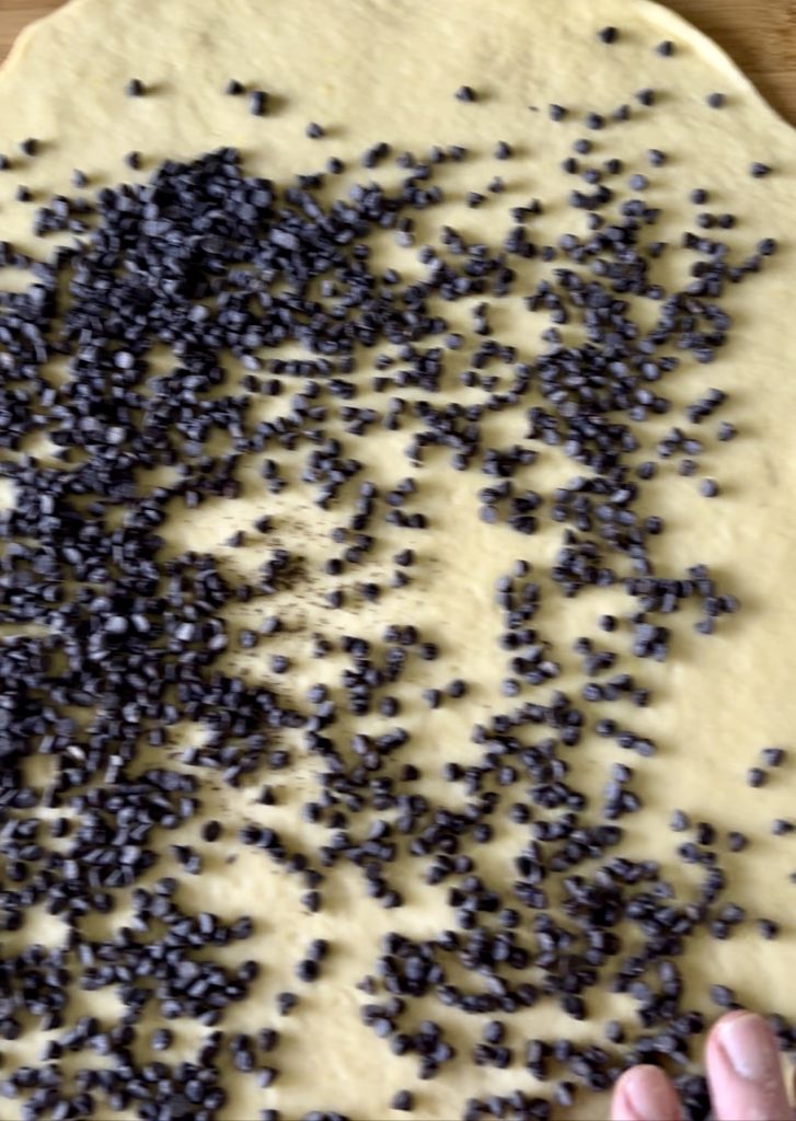 Now it’s time to fill our angel cake. I only spread chocolate chips on the rectangle, but as mentioned earlier, you can also prepare the buttercream and spread it over the entire rectangle, then add the chips and possibly some dried fruits.