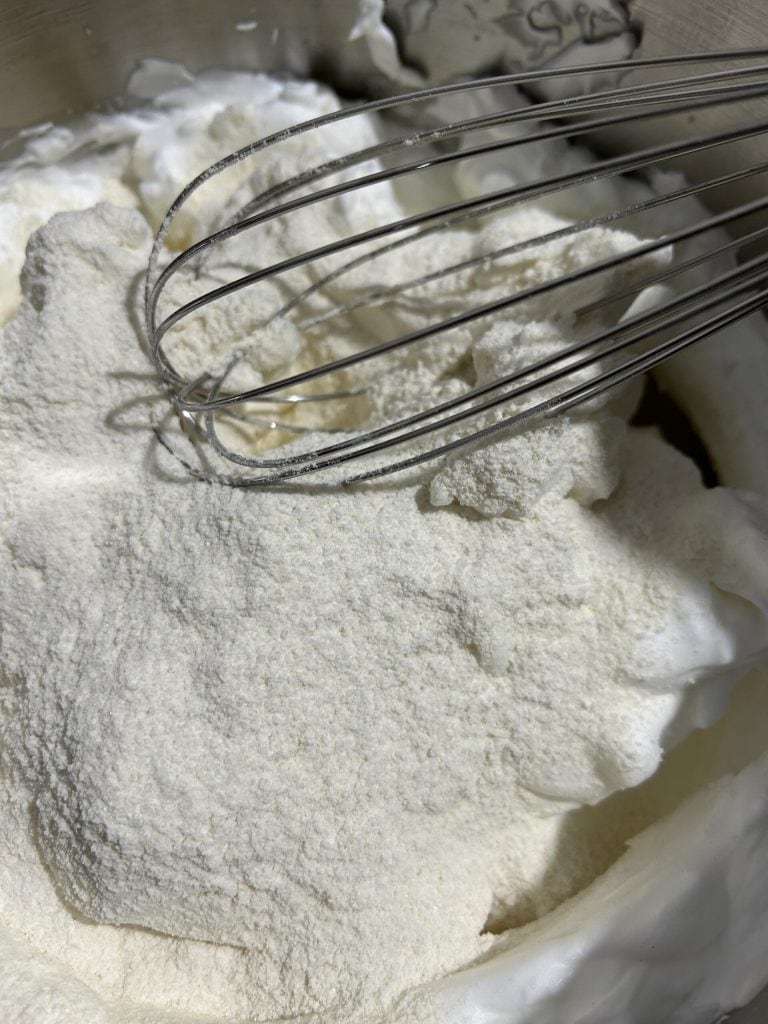 Turn off the stand mixer and, by hand, in several additions, add the flour and sugar to the whipped egg whites.