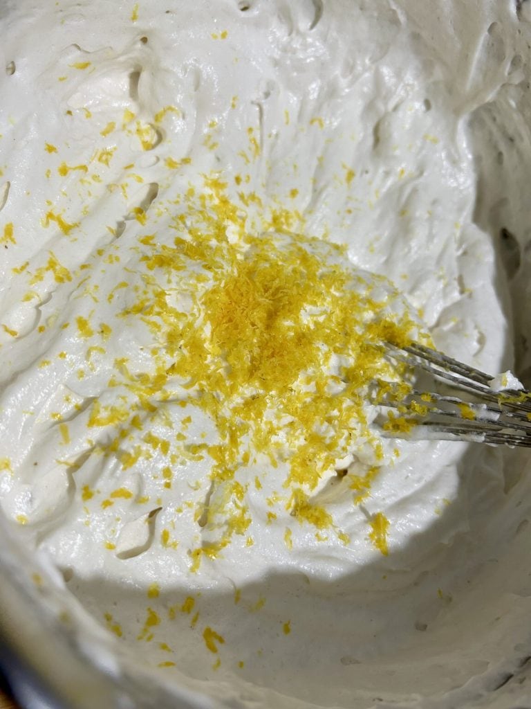 As the last step, add the grated lemon zest. Always be careful not to grate the white part of the lemon peel as it would taste bitter. Always mix with a hand whisk, using circular movements from bottom to top, to avoid deflating the batter too much.