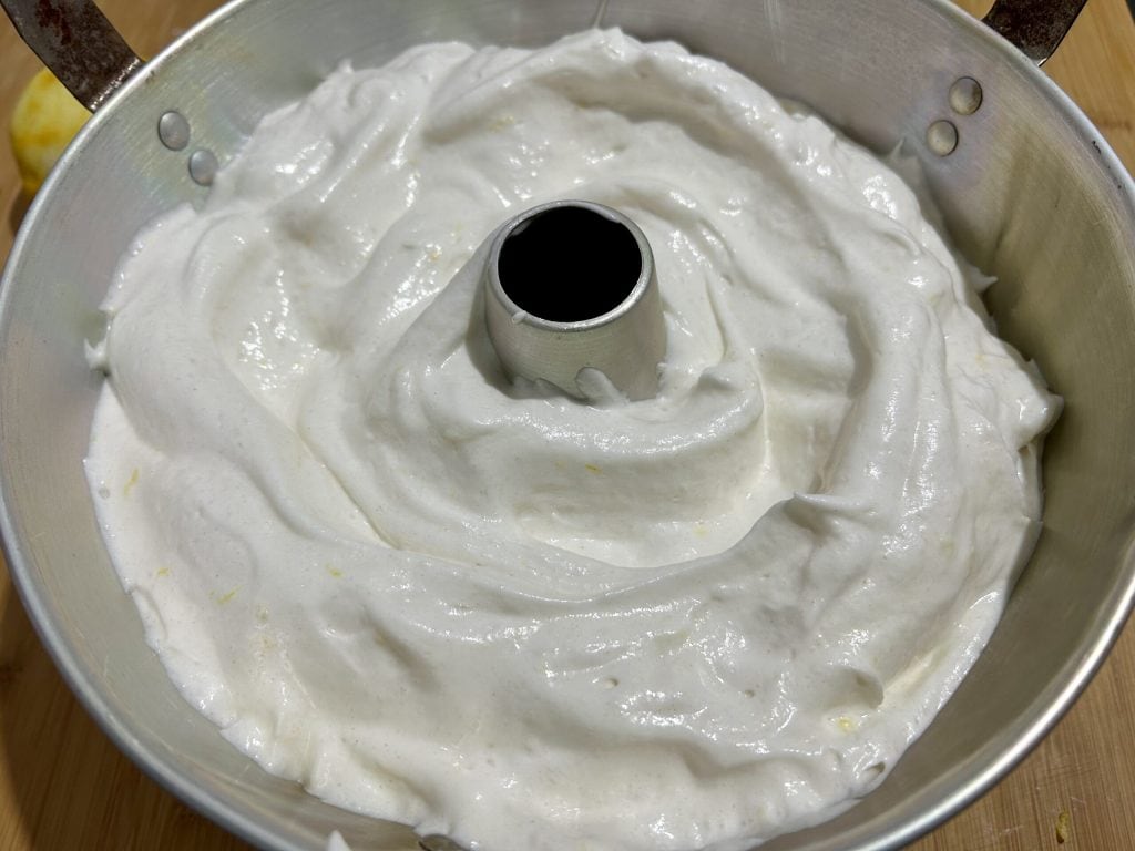 Arrange the batter in the pan as evenly as possible, using the whisk or a spatula. Bake in a preheated oven at 320°F for about 40 minutes. Do the toothpick test before taking it out of the oven. The angel food cake needs to cool upside down: if you have the chiffon cake pan there is no problem as it has special feet. If you are using another pan, use supports to cool it upside down.