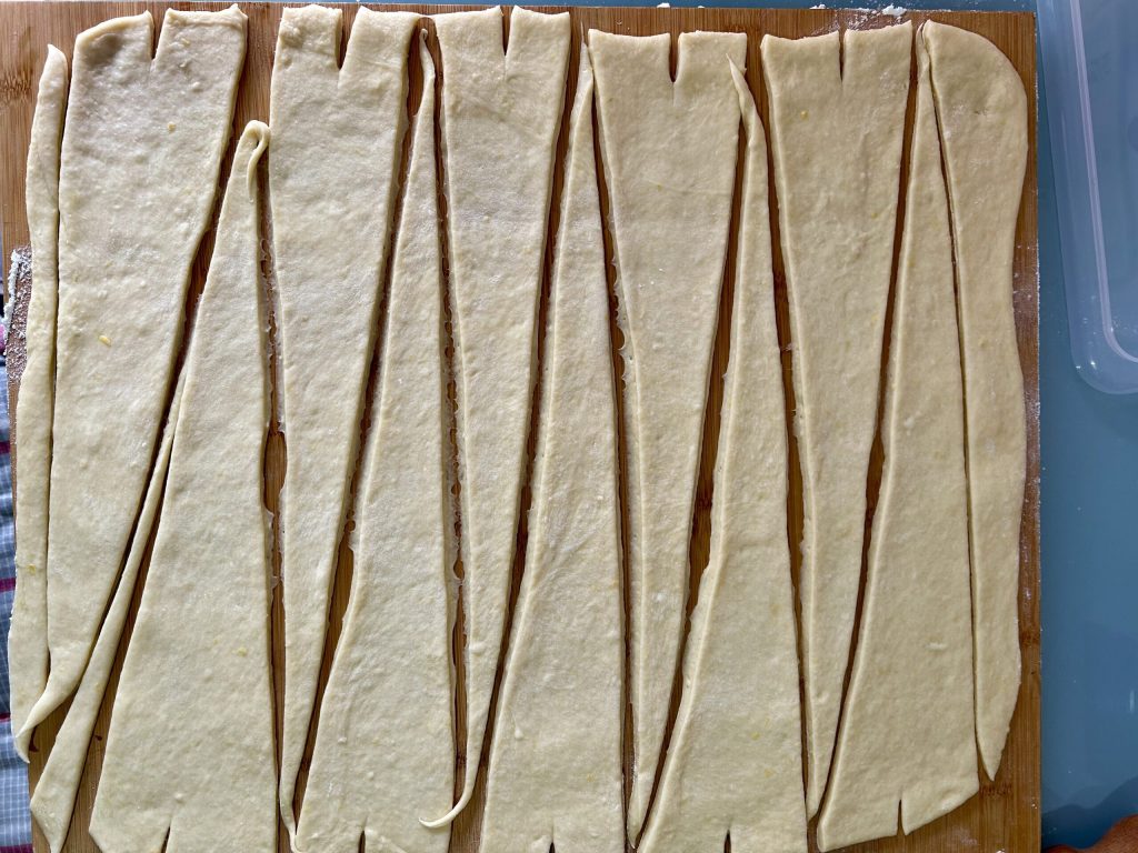 To form the croissants, cut triangles with a smooth pastry cutter and make a small incision at the base of each triangle.