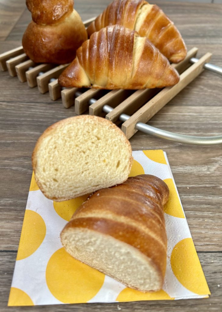 Brioche with sourdough, tender brioche with a long natural fermentation, featuring a soft and fragrant dough. The brioche dough is very simple to prepare and does not require the use of large amounts of butter. You can shape it as you like into croissants, brioche col tuppo, or the classic shape of Roman maritozzi. They are, of course, different in preparation from puff pastry croissants but still very good and tasty.