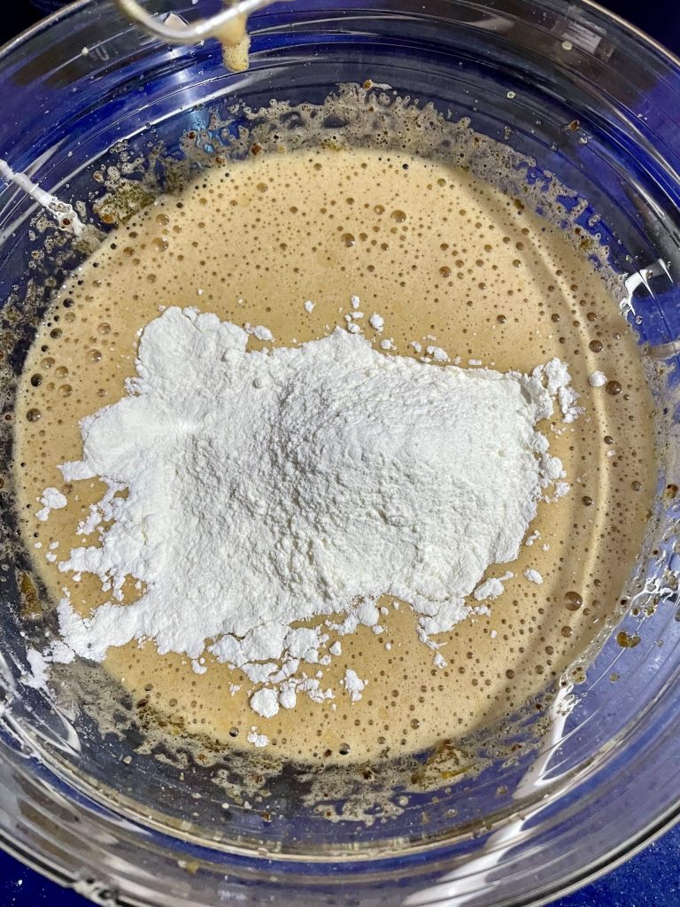 When the eggs are nice and fluffy, add the flour and salt; continue mixing with the electric whisk, but lower the speed a bit.