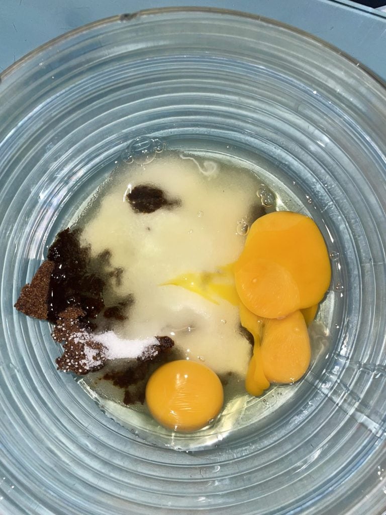 In another bowl put the eggs with all the sugar and start beating them well to whip them; when they are whipped, add the melted chocolate and mix again. Finally, add the flour, cocoa, and chocolate chips, always mixing with the electric whisk.