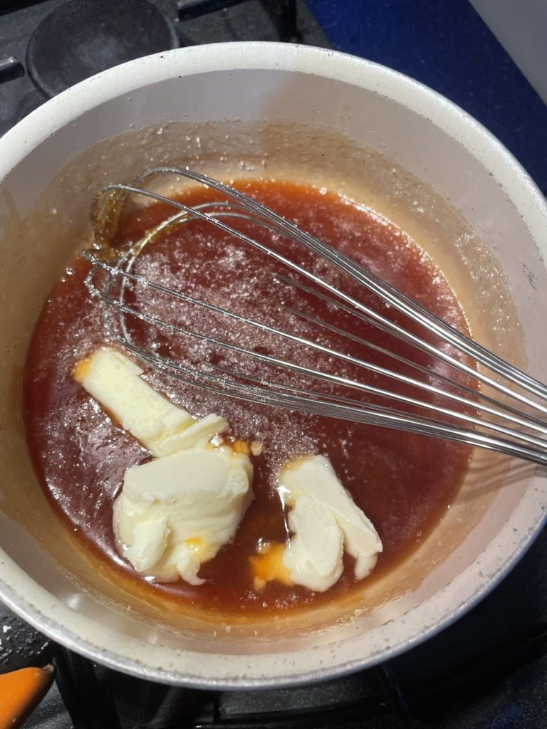 After mixing the cream well with the sugar, add the cold butter in pieces and mix with the help of a fork or a whisk. Add the salt and your salted caramel will be ready. I recommend transferring it to a glass container to cool.