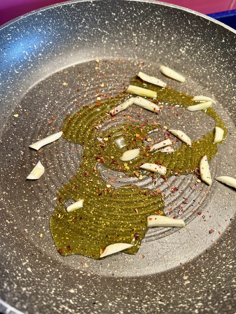 In a non-stick pan, pour the oil along with the garlic cloves and chili pepper. Sauté everything until the garlic turns golden, then add the chicory. I recommend using scissors to cut it a bit to ease cooking. Adjust the salt to your taste and let the chicory sauté in the pan for about 5 minutes, stirring a couple of times to let it absorb the flavors well. To prevent the cooking water from evaporating too much and to keep the chicory soft and juicy, it’s better to cover the pan with a lid during cooking.