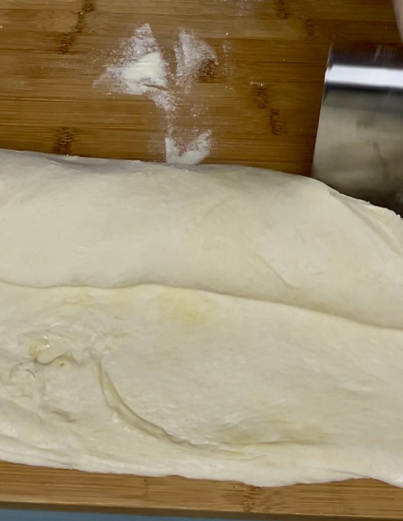 At this point, using a dough scraper to prevent it from sticking to the work surface, gently roll the dough onto itself.