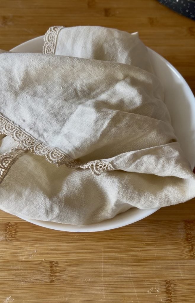 • Take the roll of dough and gently round it with your hands to form a loaf. Place it in a basket lined with a linen cloth, making sure to seal the seam well by pinching it with your fingers to prevent it from opening during rising. Cover the loaf as shown in the photo and let it rest in the refrigerator for at least 8-9 hours.