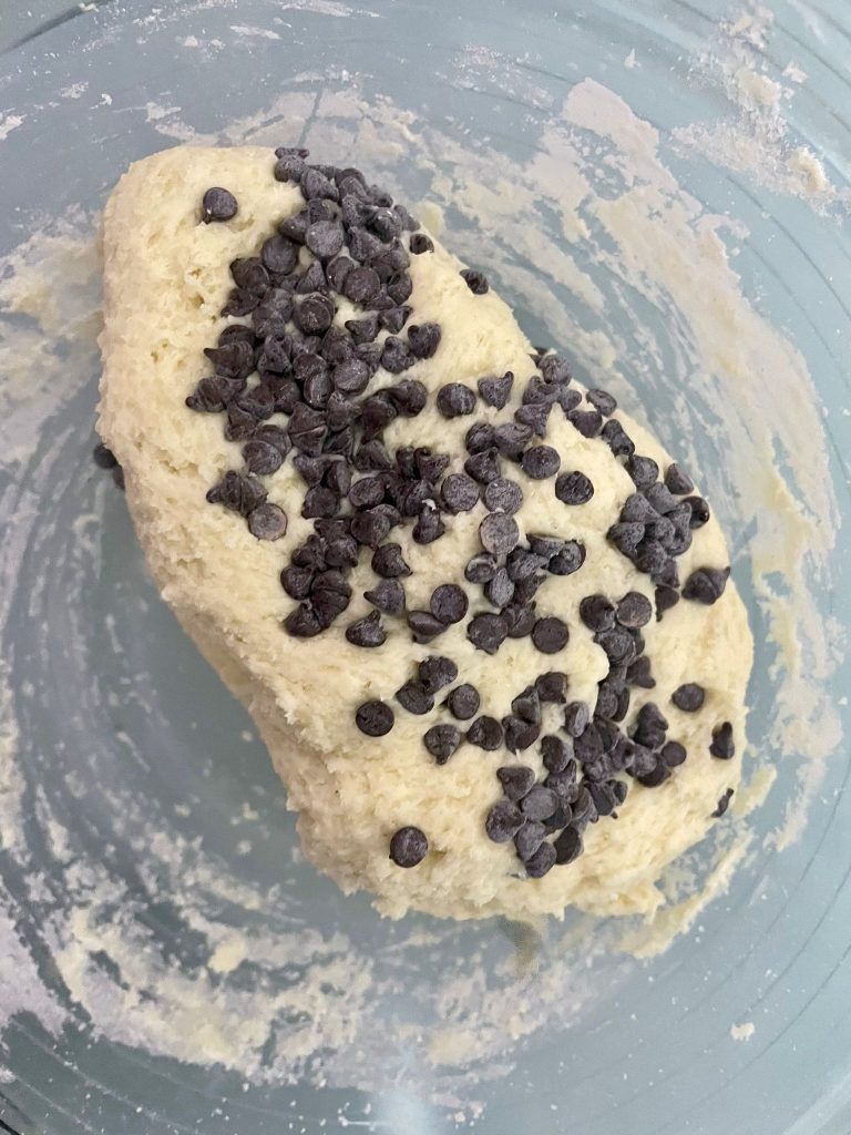 Now add the flour in several batches, always mixing by hand, salt, vanilla extract, baking powder, and soft butter. Knead until you get a soft dough (keep it in the bowl because it’s a bit sticky). As a final step, add the chocolate chips and mix just to blend.
