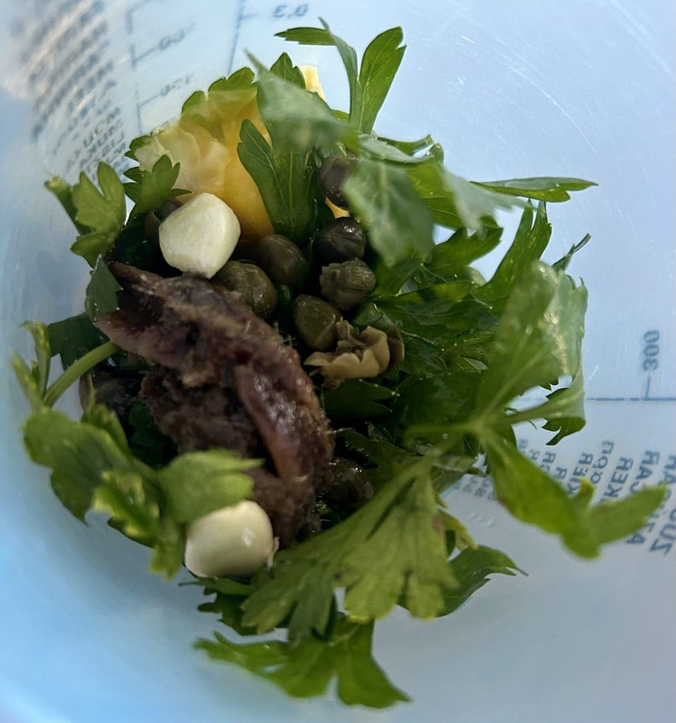 I used ingredients I already had in my pantry — parsley, garlic, anchovy fillets, capers, pickles, crustless white bread, and a splash of vinegar — and the result was surprising: a fragrant, creamy, and full-bodied sauce.