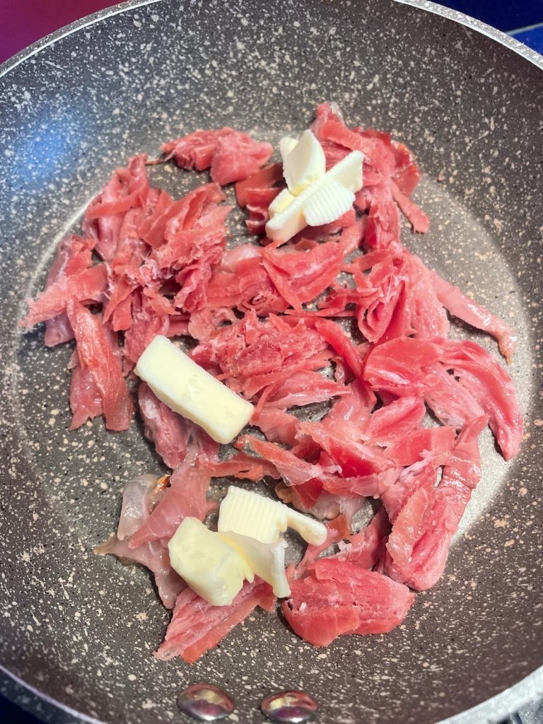Cut the cured ham into strips and place it in a non-stick pan with the butter. Sauté until crispy, being careful not to burn it.