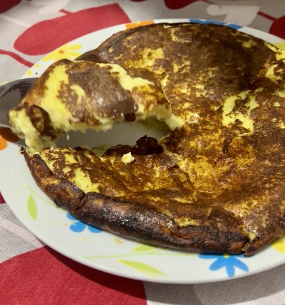 When the surface appears dry, use the lid to flip the frittata and brown the other side as well. Once well cooked on both sides, it is ready to be served!