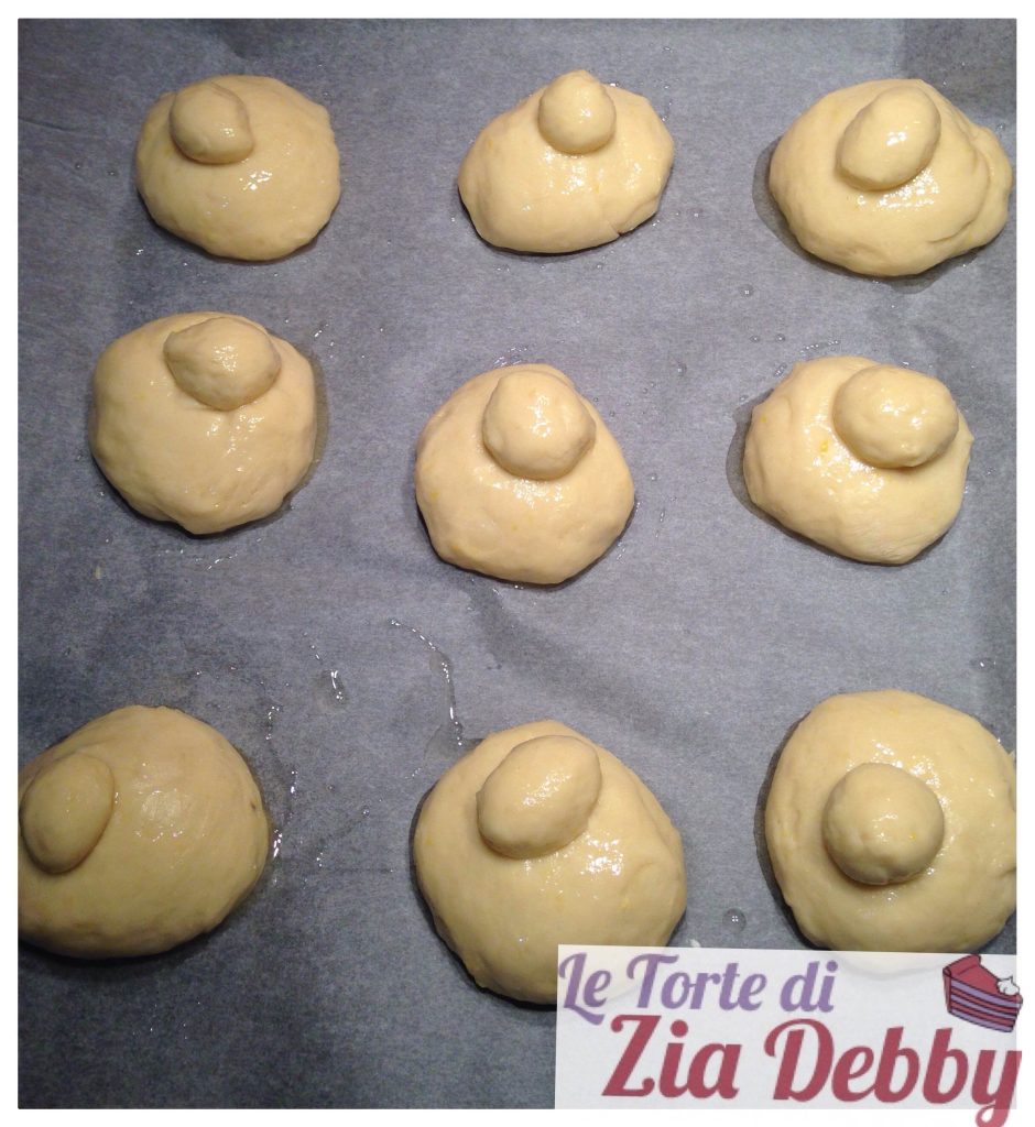 • To make the brioche, turn the pieces on themselves as if to roll them and create the “balls” and small balls to overlap. To prevent the tuppo from escaping (as happened to me, you will see it in the photos), you can attach it with a little egg white. Place your brioches on a baking tray covered with parchment paper, a bit apart from each other as they rise a lot. Brush them with a little vegetable oil to store them again to rise, covered with a plastic sheet, and avoid that during the rising this sheet sticks to the brioches.