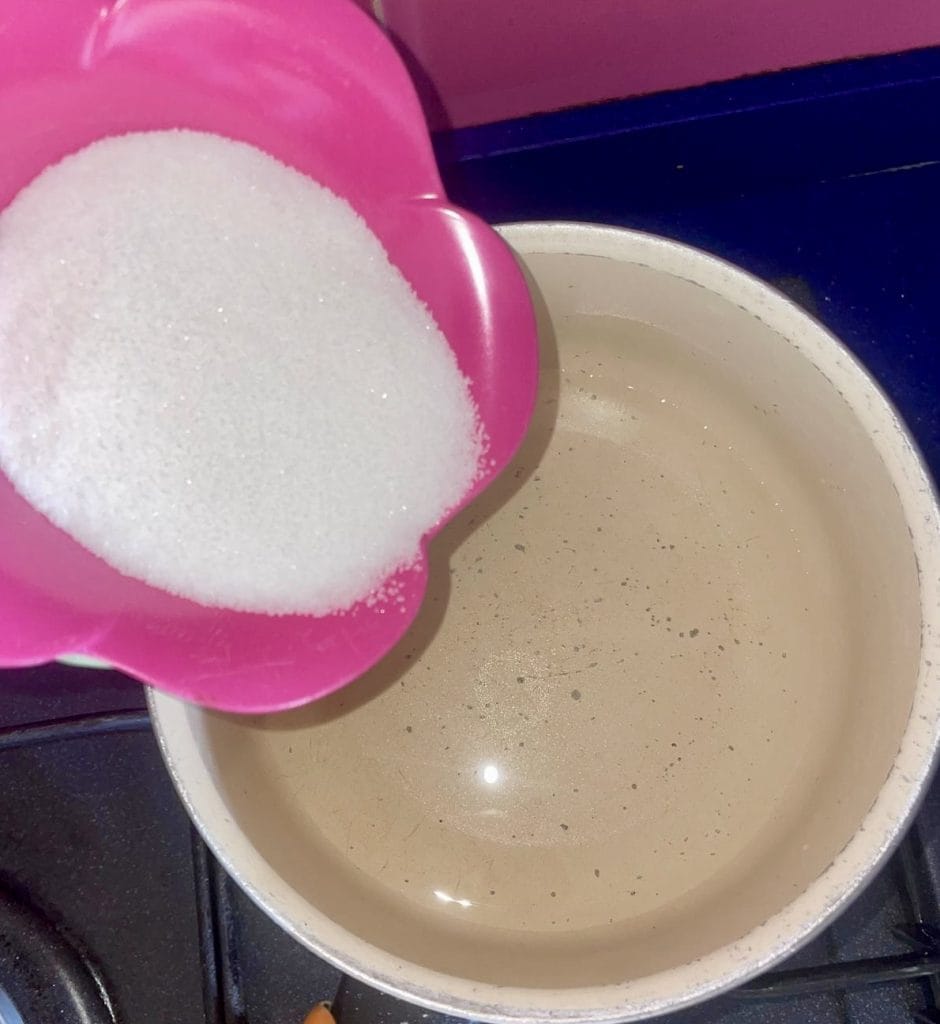 Pour the water into a saucepan and put it on the heat. Add the sugar and stir until it is completely dissolved.