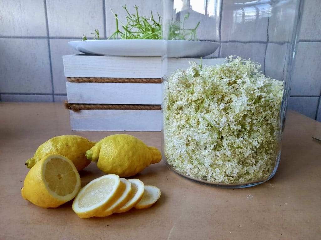 Elderflower syrup is prepared using only the flowers, which I recommend gathering in mountain or pollution-free areas because they should be used unwashed to retain the naturally present pollen, otherwise, the flavor would be affected. The lemons, on the other hand, acidify the solution to prevent fermentation during infusion.
